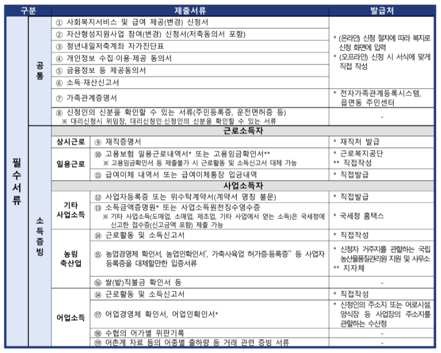 필요 서류가 생각보다 많습니다. 온라인과 오프라인에 필요한 서류는 동일하지만 제출방법이 차이가 있으니 확인이 필요합니다. 해당 제출 서류는 청년내일저축계좌 신청자 가구의 소득, 소득인정액 확인 및 심사를 위한 자료로서 제출서류가 미비한 경우에는 지원대상에서 제외될 수 있으니 해당 서류를 꼼꼼하게 확인하여 반드시 기한 내에 제출하여 주셔야 합니다.